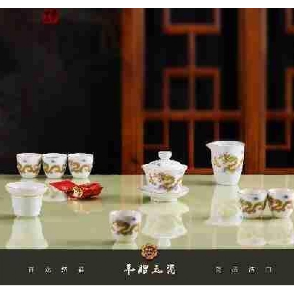 羊脂玉瓷祥龙纳福10件套组 盖碗+公道杯+茶漏组+茶杯+茶叶