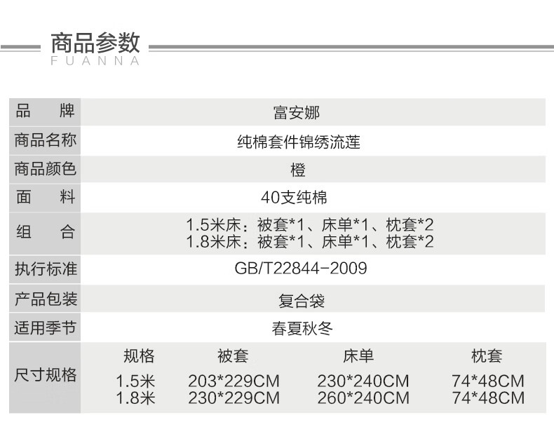 商品名称:富安娜 纯棉四件套-锦绣流莲 被套203*229cm 2.5KG