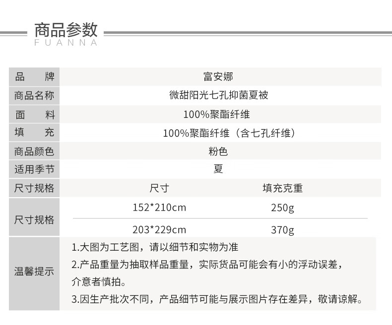 商品名称:富安娜 微甜阳光七孔抗菌夏被 152*210cm(250g)