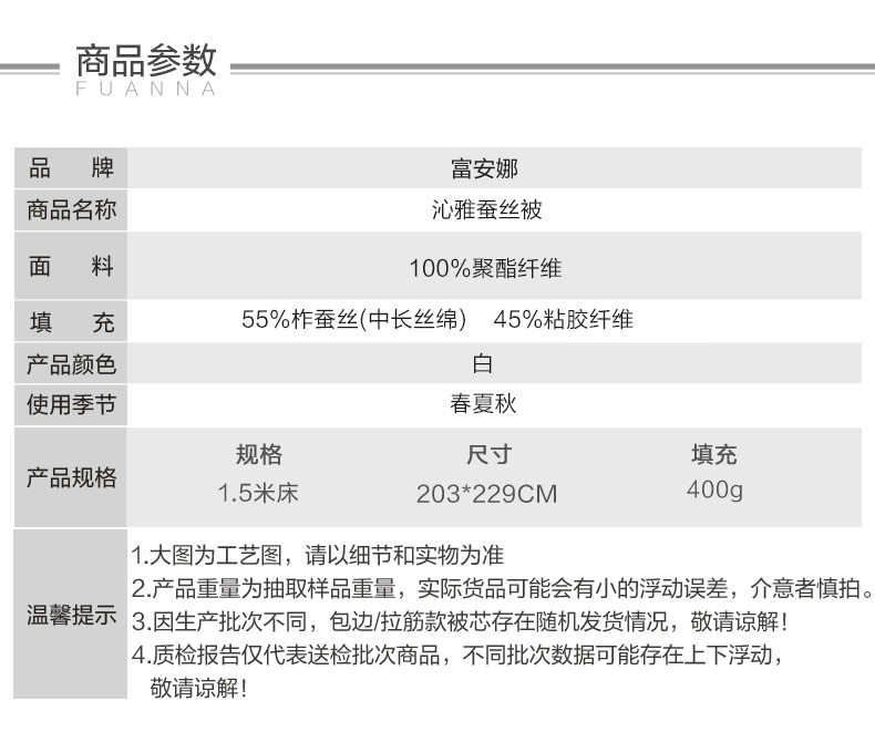 商品名称:富安娜 沁雅蚕丝被 203*229cm(400g)
