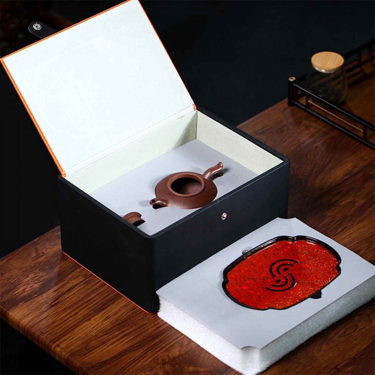 茶盘、茶壶各一个,含手提袋皮革包装。
