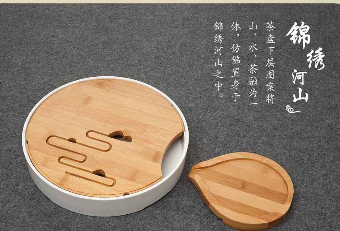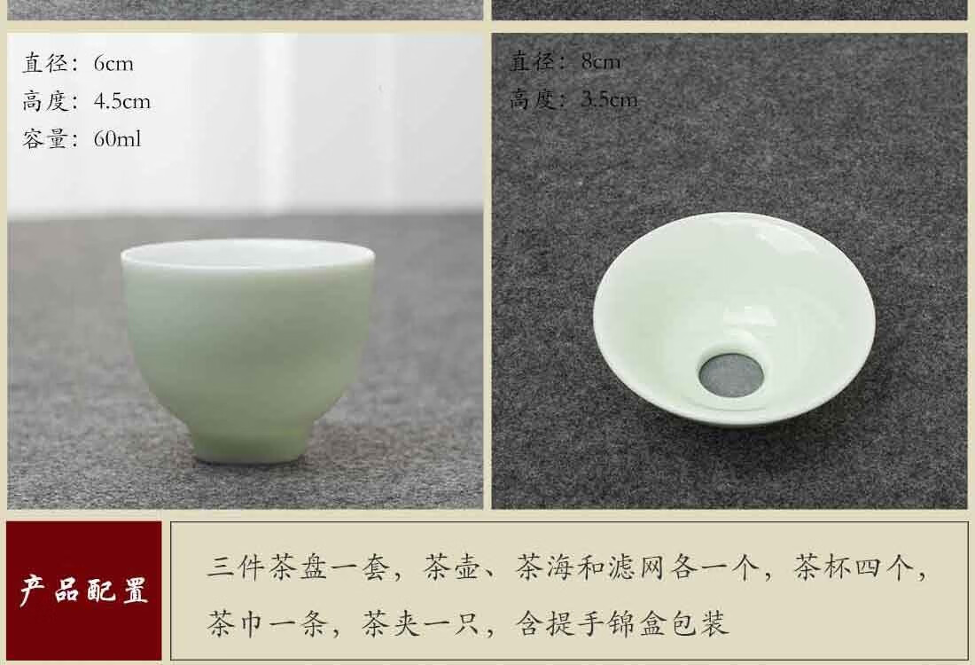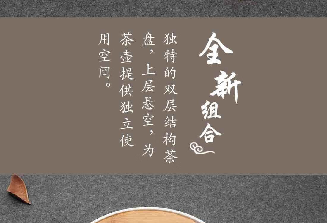配置清单 :双层茶盘一套,茶壶、茶海和滤网各一个,茶杯四个,茶巾一条,茶夹一只,含提手锦盒包装