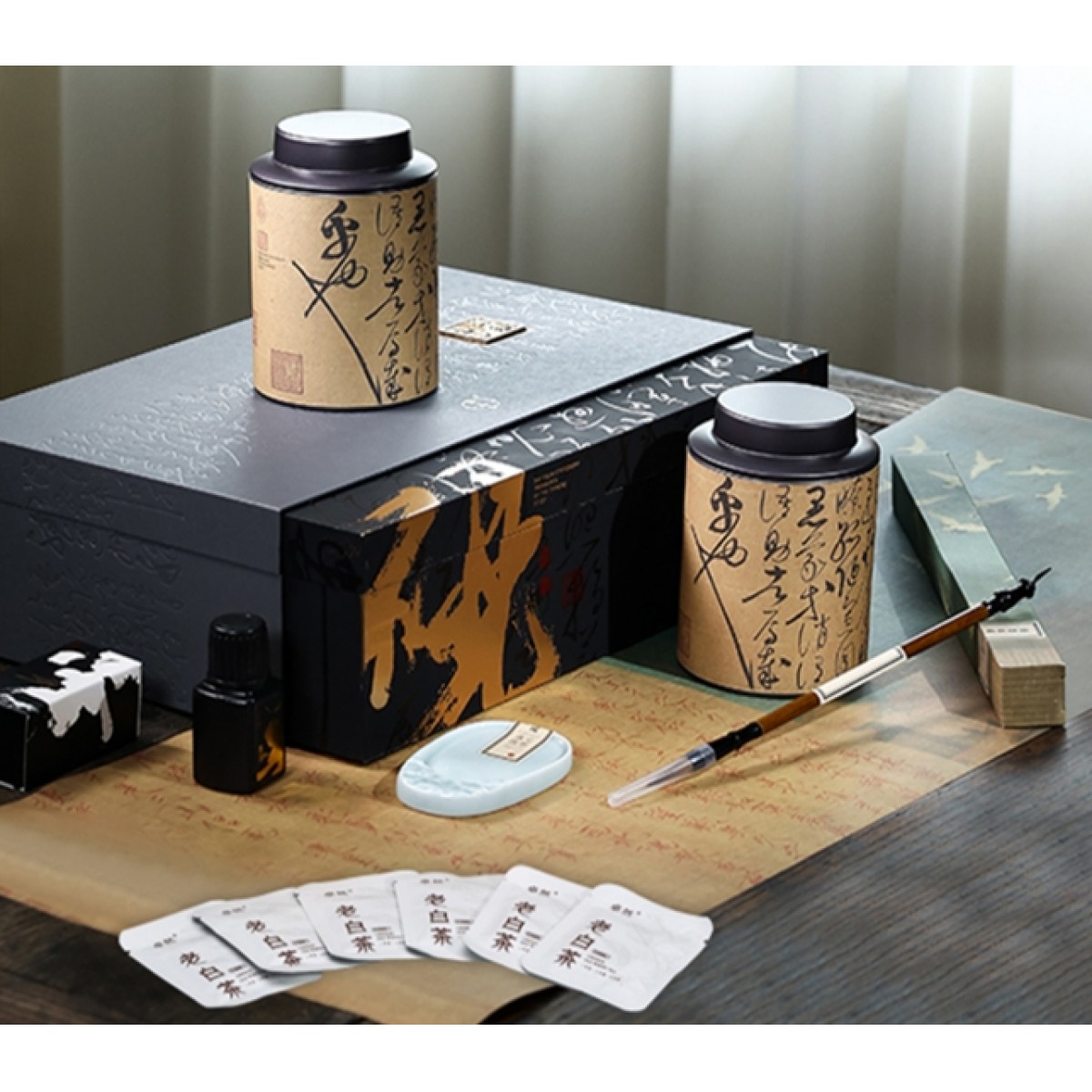 饼干形老白茶36泡(共180克),毛笔一支,墨水一盒,宣纸一副,砚台一个,含手提袋礼盒包装。