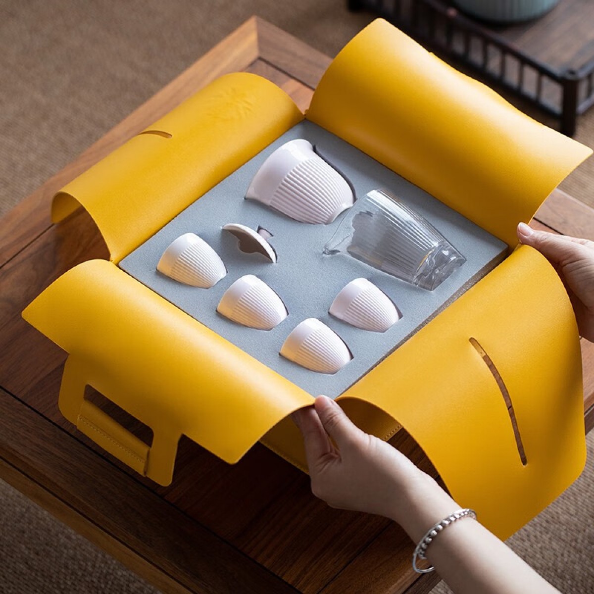 茶壶、茶海各一个,茶杯四个,茶巾一条,含提手皮革包装