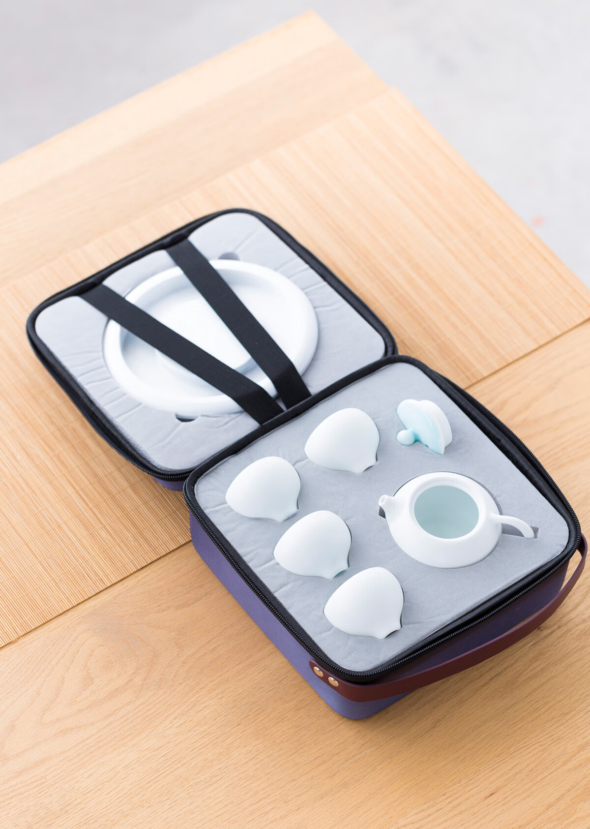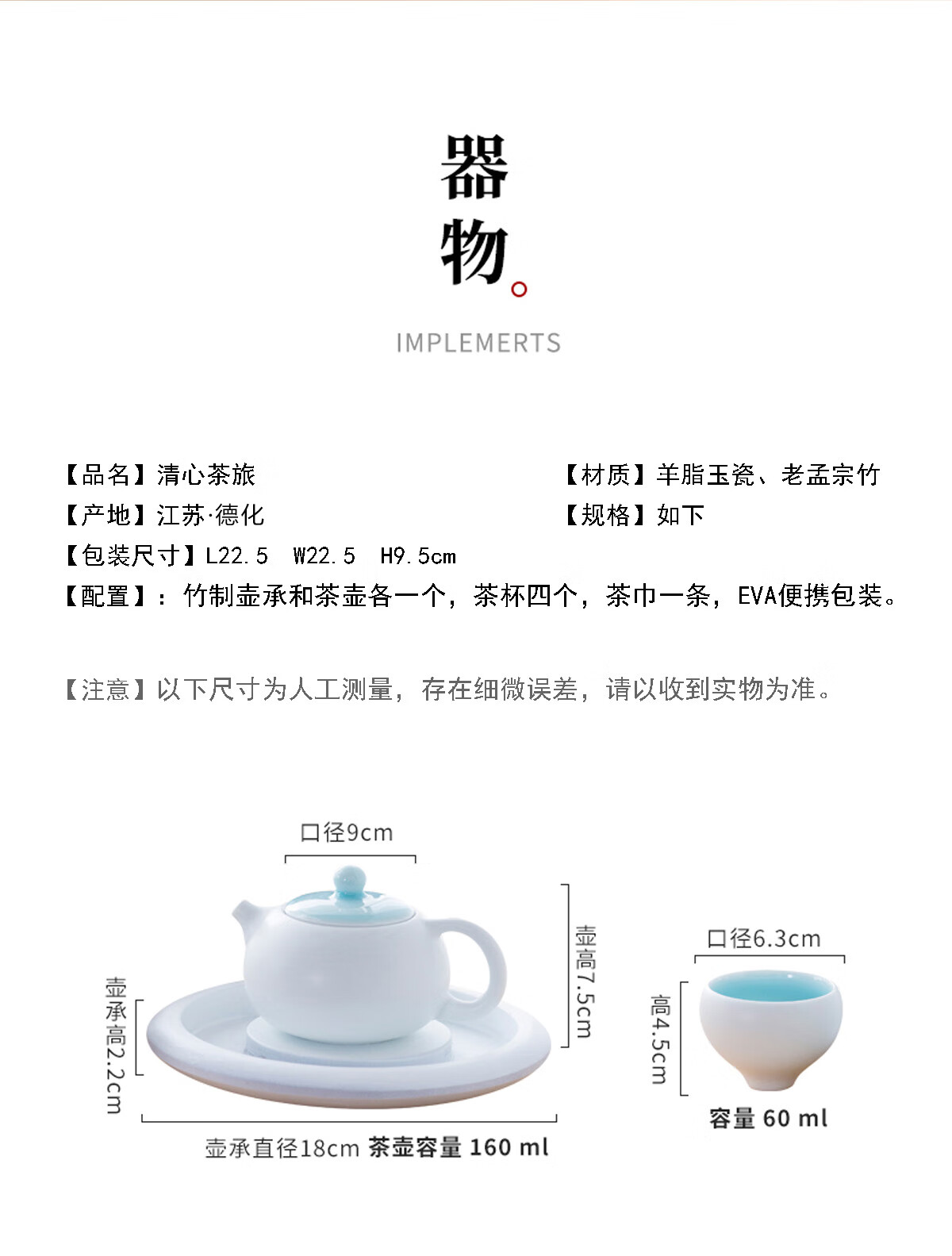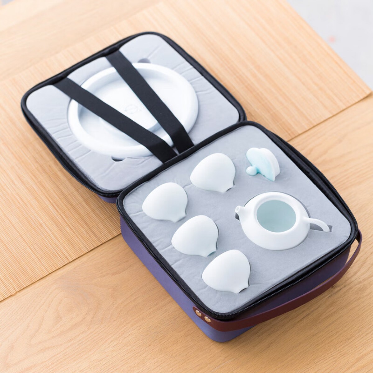 配置清单 :竹制壶承和茶壶各一个,茶杯四个,茶巾一条,EVA便携包装