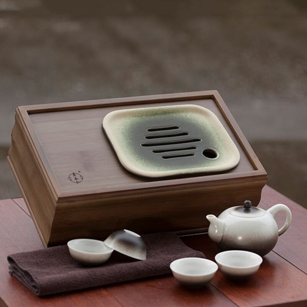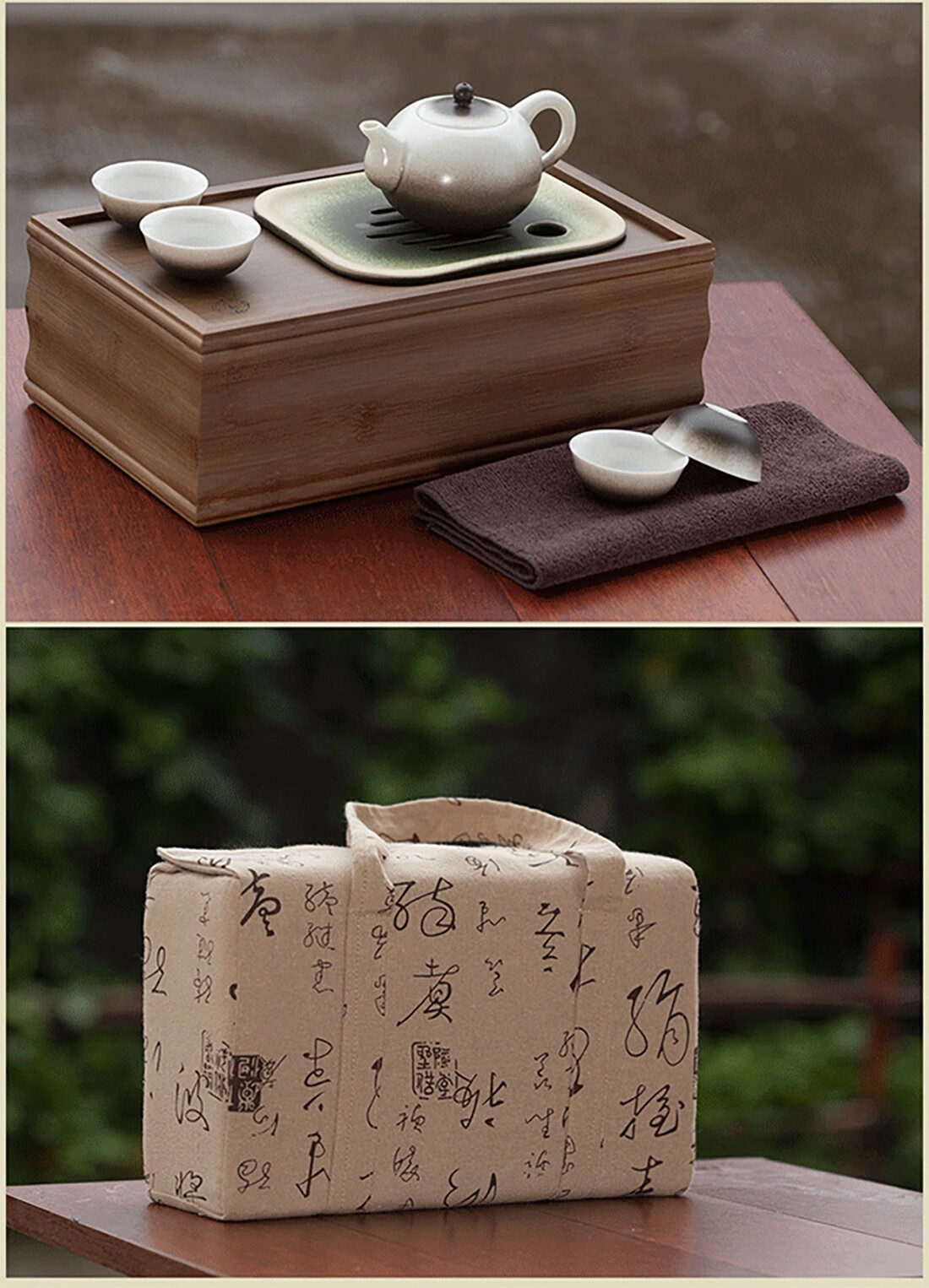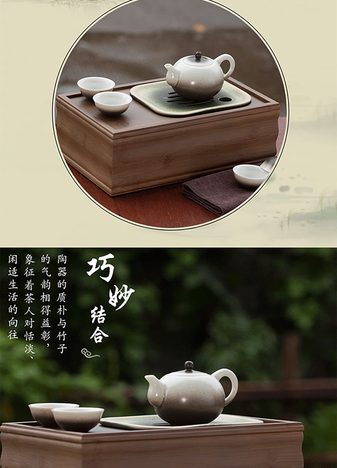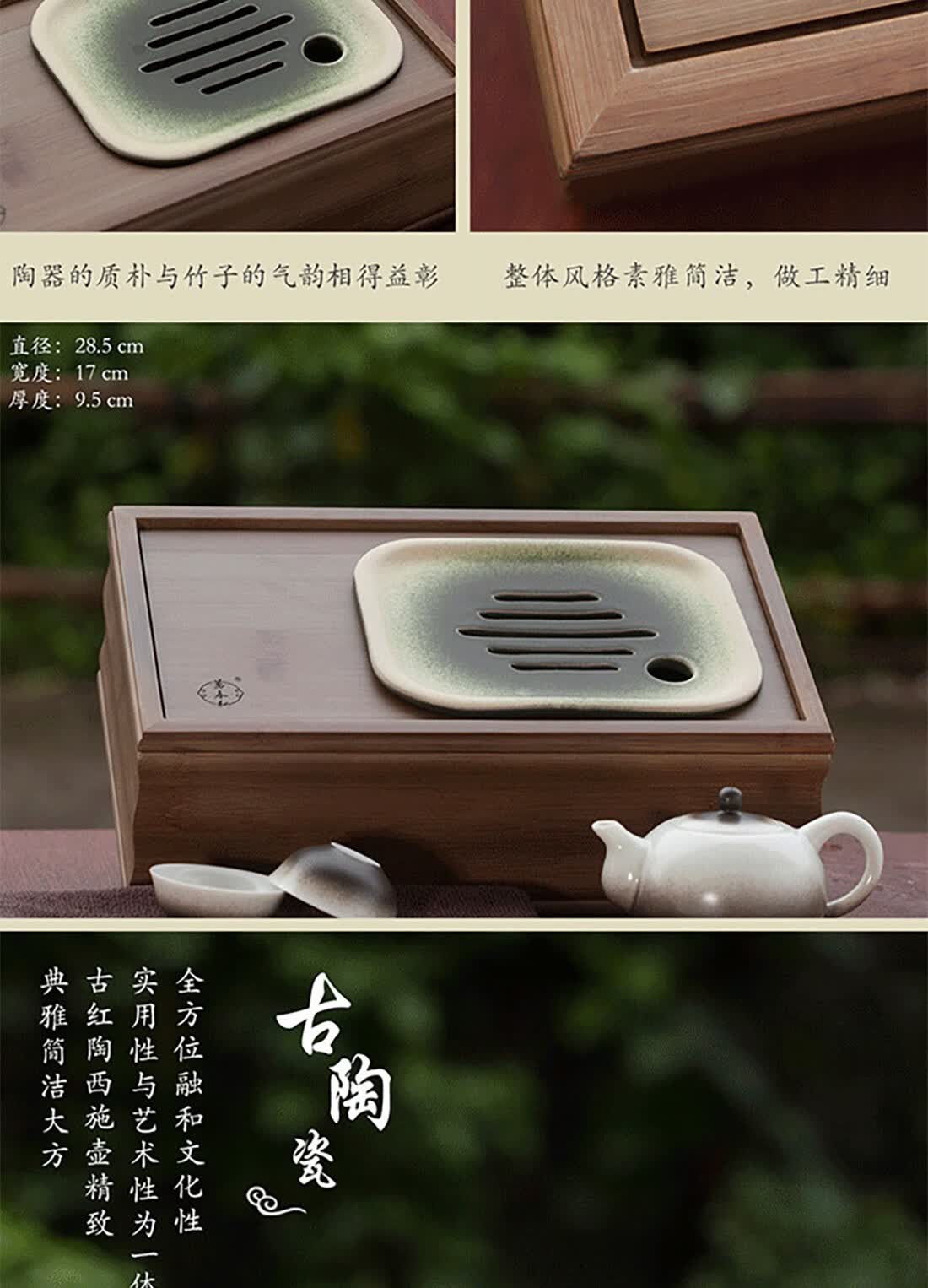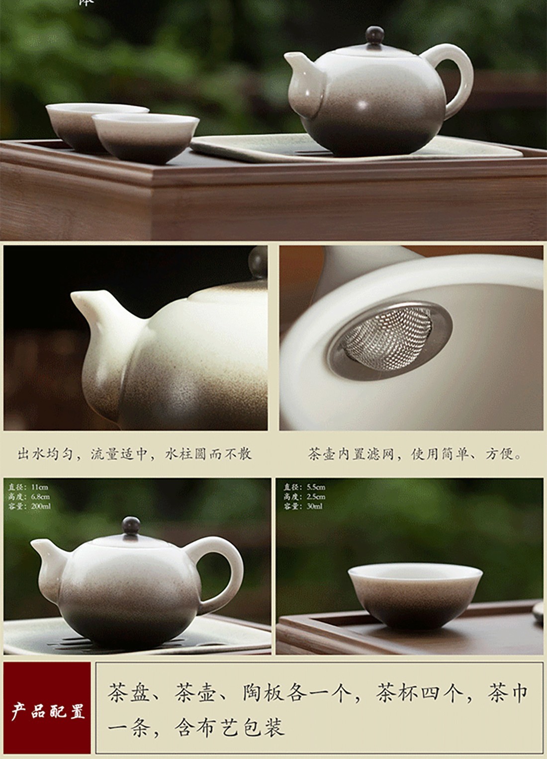 配置清单 :茶盘、茶壶、陶板各一个,茶杯四个,茶巾一条,布艺包装