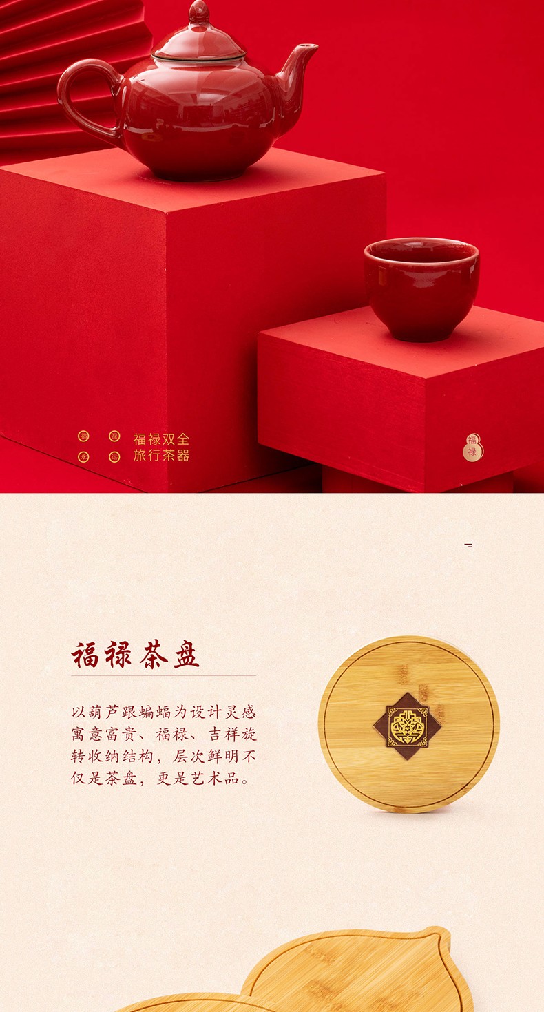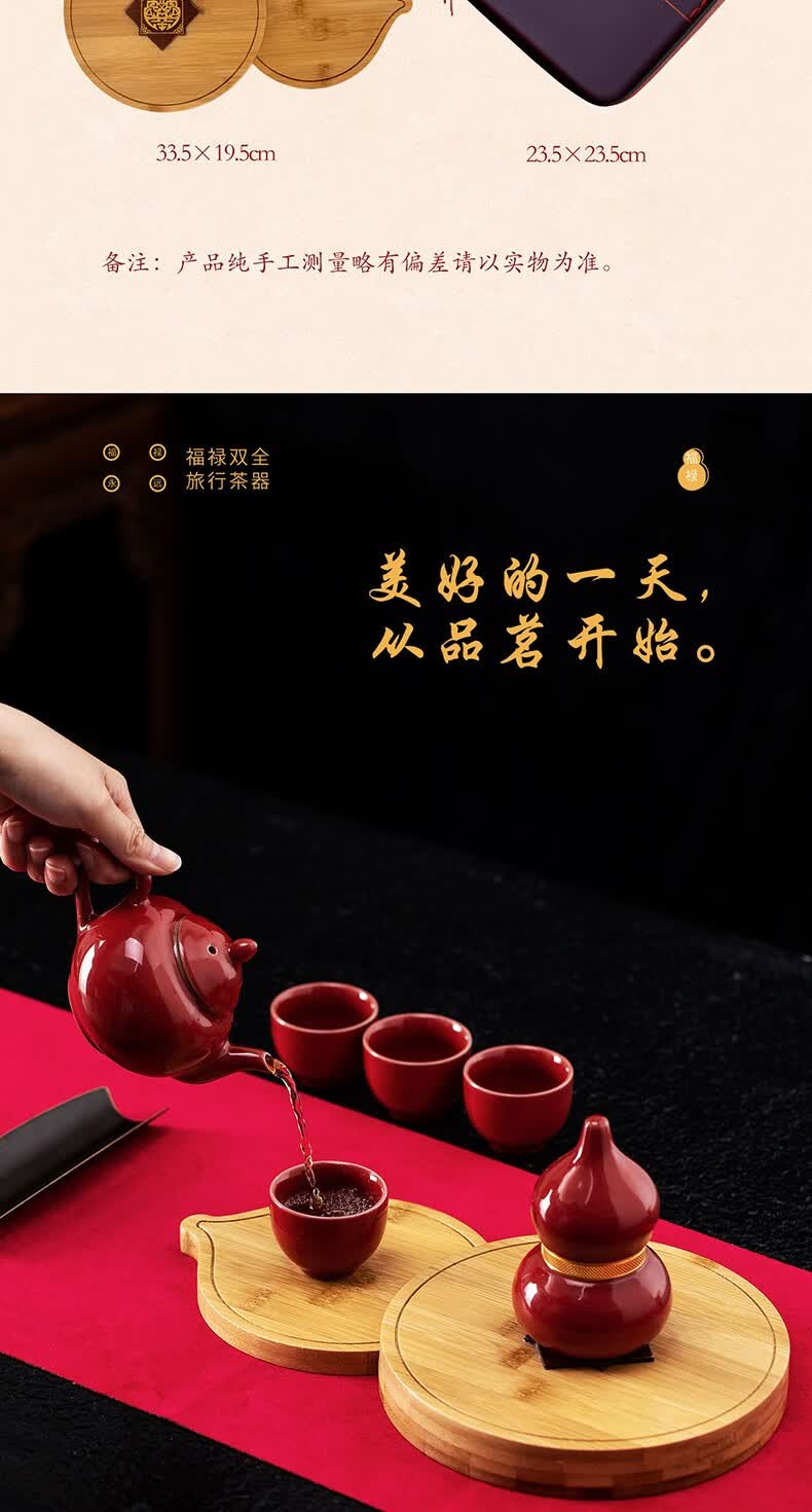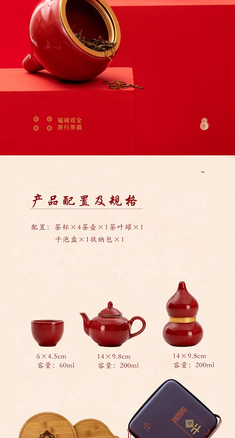 配置清单 :茶盘和茶壶各一个,茶杯四个,葫芦茶叶罐一个(含10克大红袍), 茶巾一条,EVA便携包装