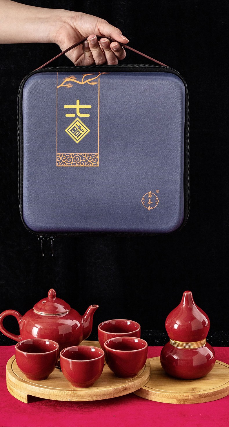 茶盘和茶壶各一个,茶杯四个,葫芦茶叶罐一个(含10克大红袍), 茶巾一条,EVA便携包装