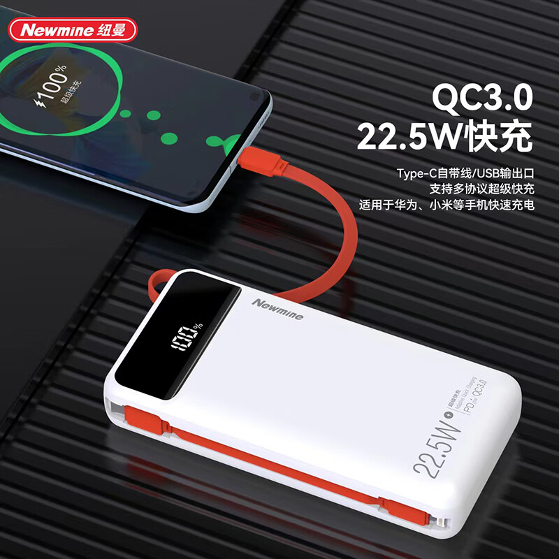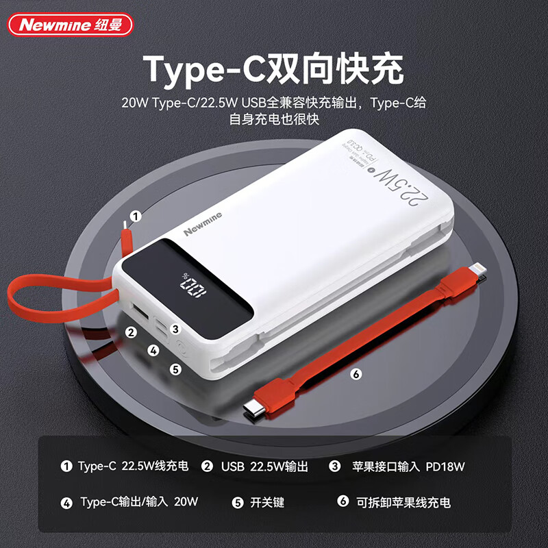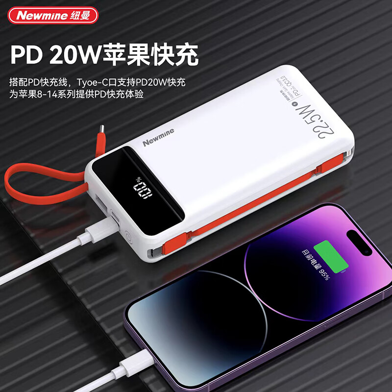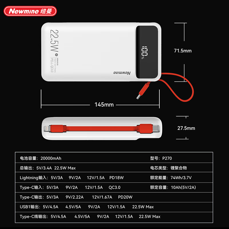 商品名称:纽曼 20000毫安自带线快充数显移动电源 P270