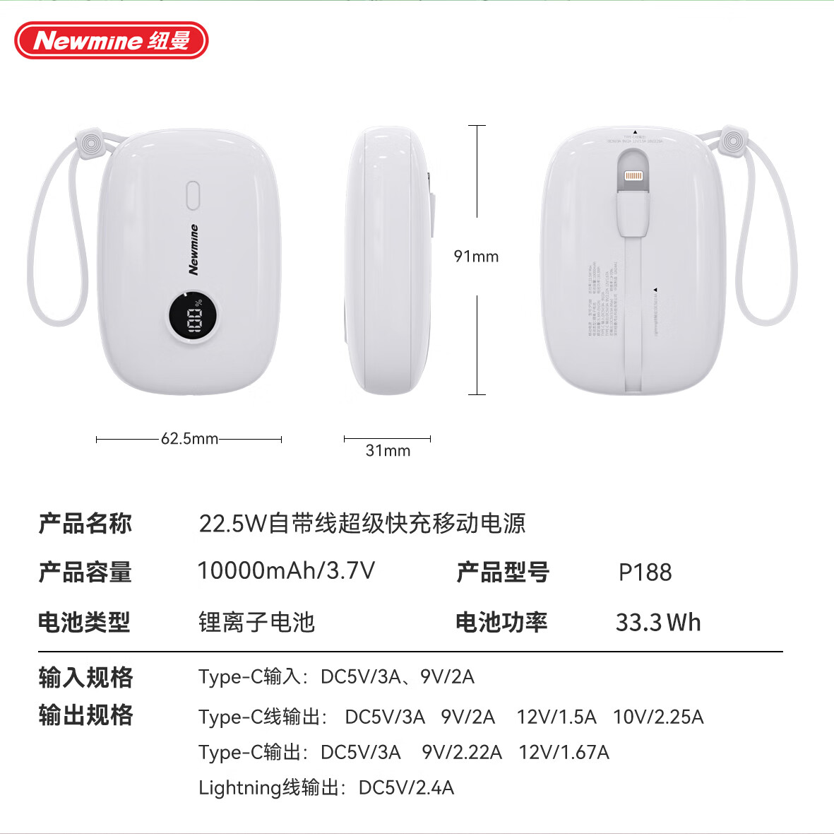 商品名称:纽曼 10000毫安自带线快充数显移动电源 P188
