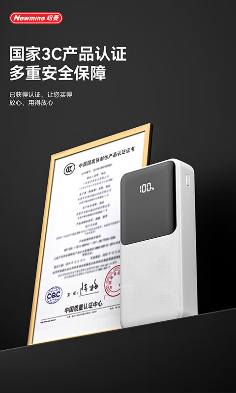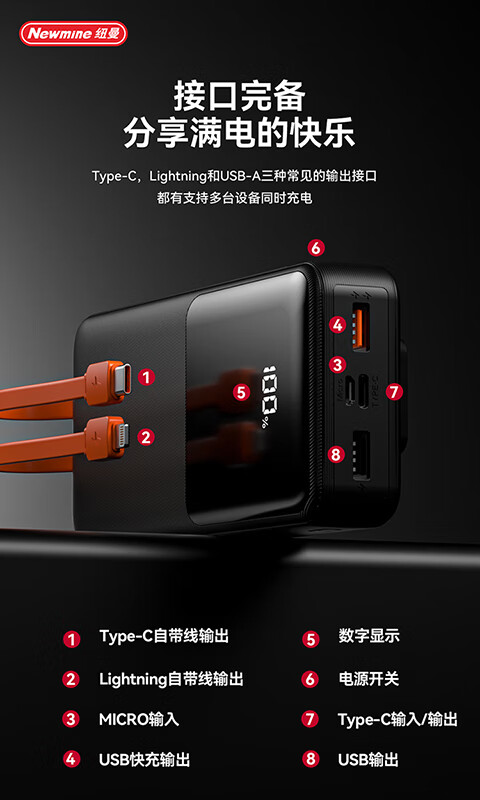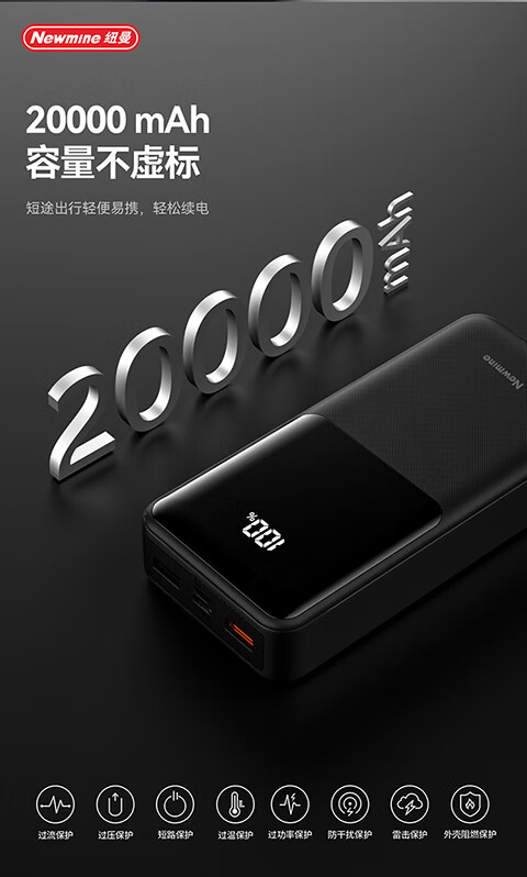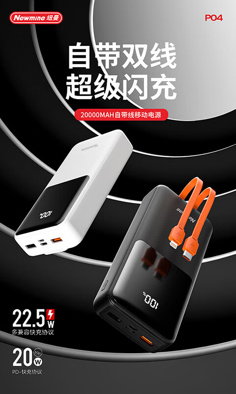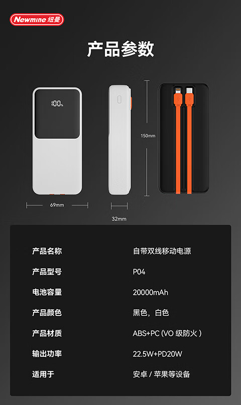 商品名称:纽曼 20000毫安自带线快充数显移动电源 P04