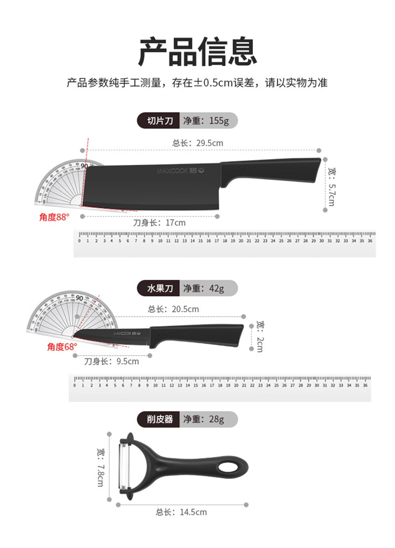 切片刀:29.5*5.7cm 水果刀:20.5*2cm 削皮器:14.5*7.8cm