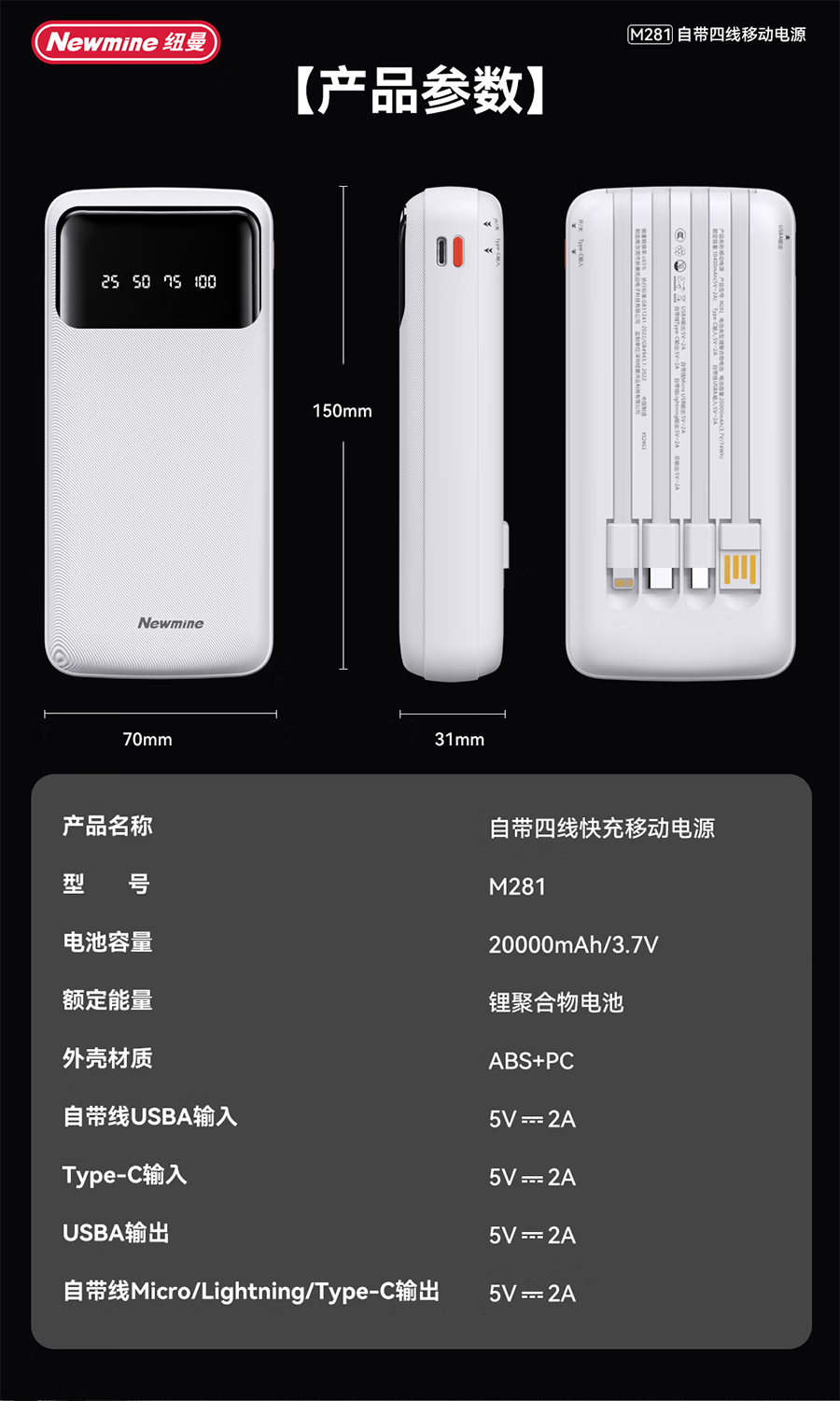 商品名称:纽曼 20000毫安自带四线移动电源