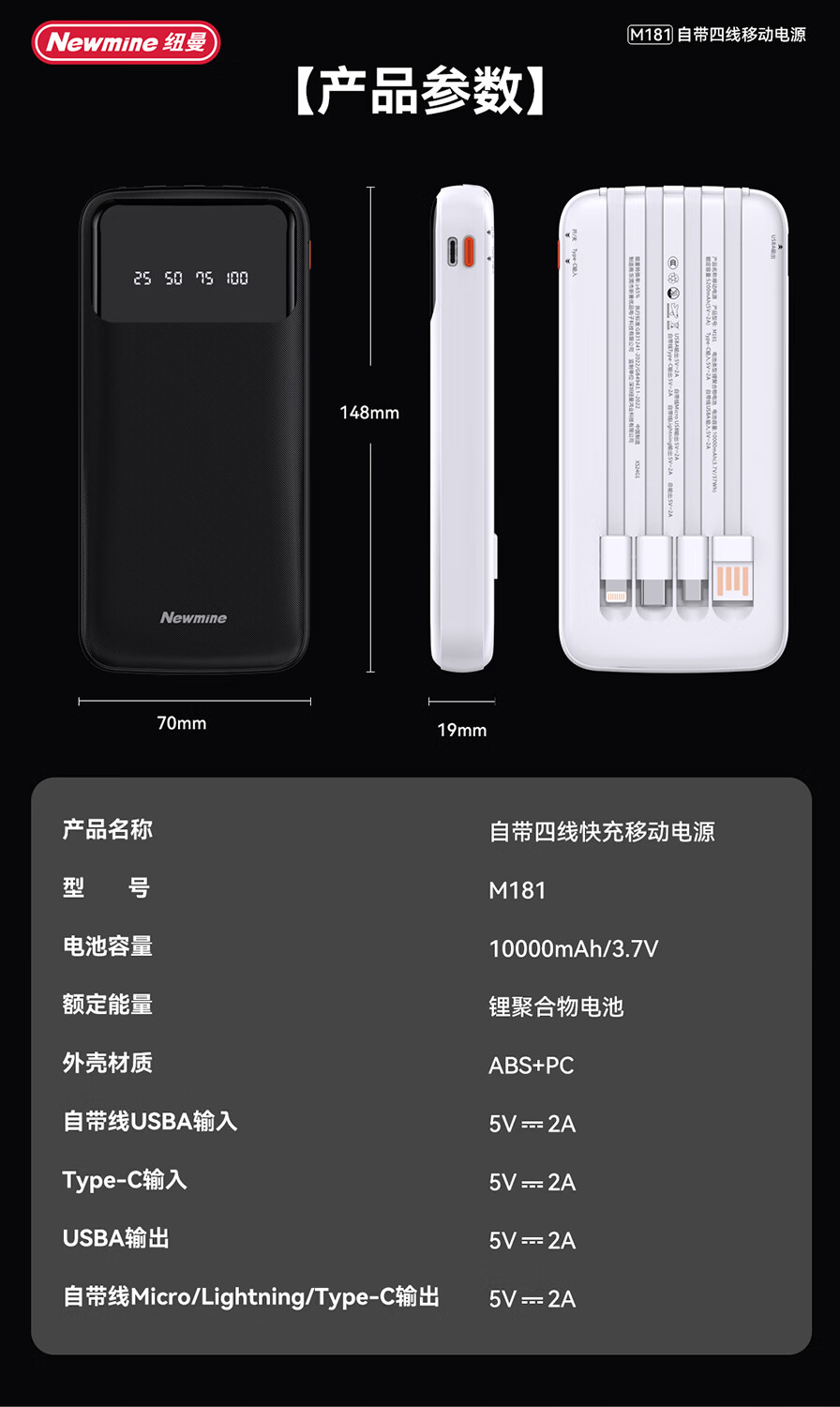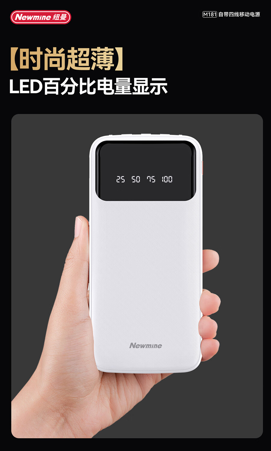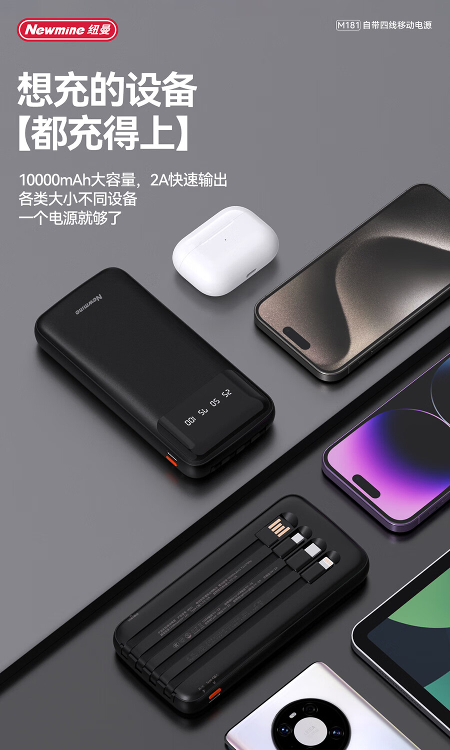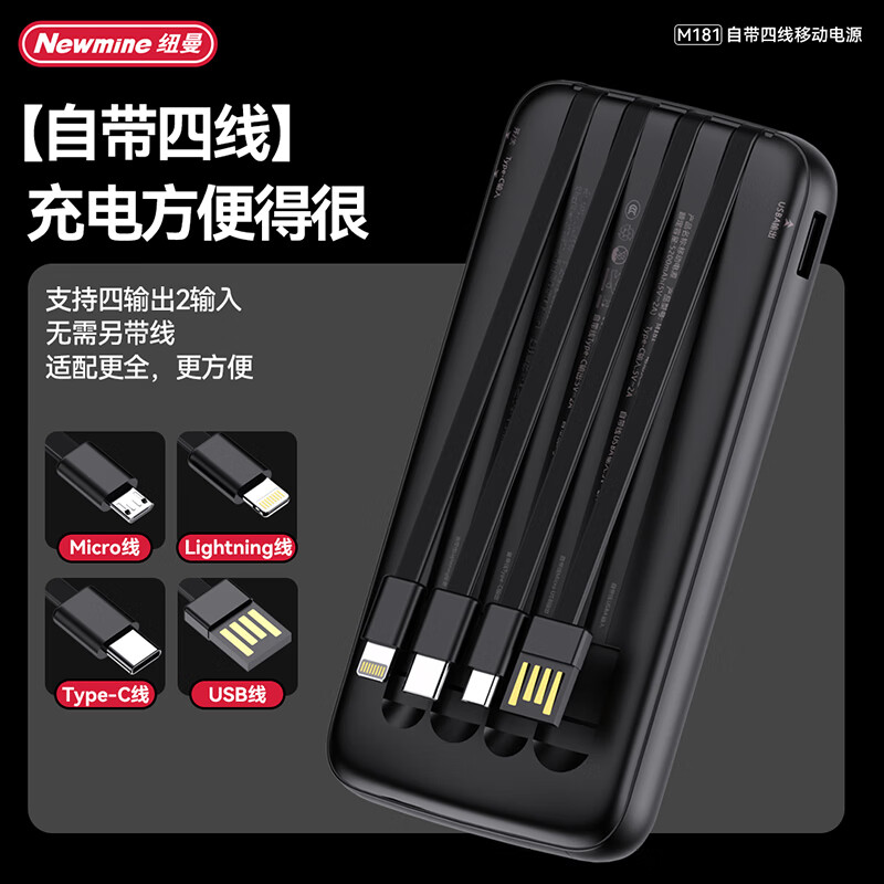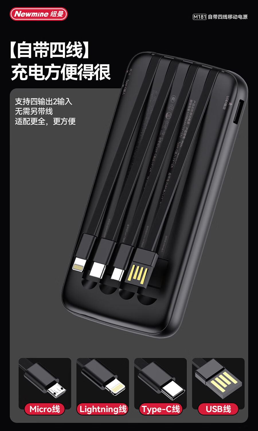 商品名称:纽曼 10000毫安自带四线移动电源 M181