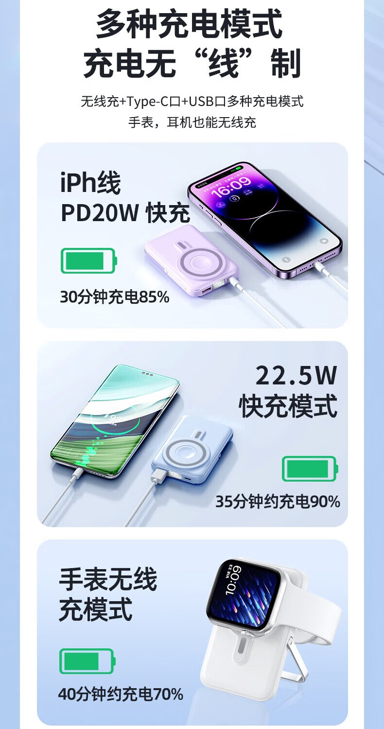 功能 :PD快充 磁吸充电宝 可上飞机 (27000mAh以下)