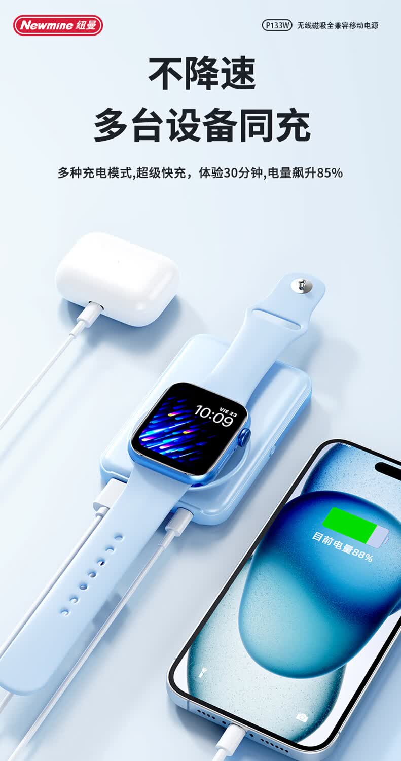 商品名称:纽曼 10000毫安无线磁吸快充移动电源 P133W