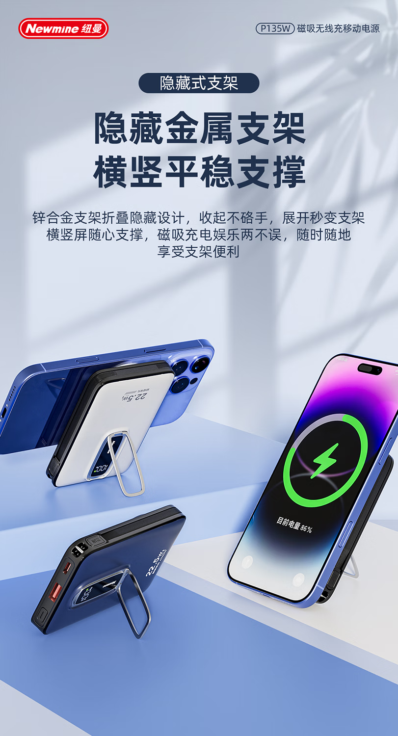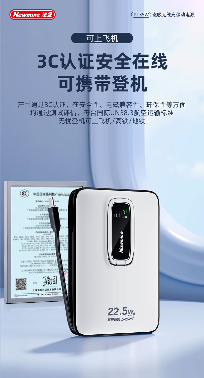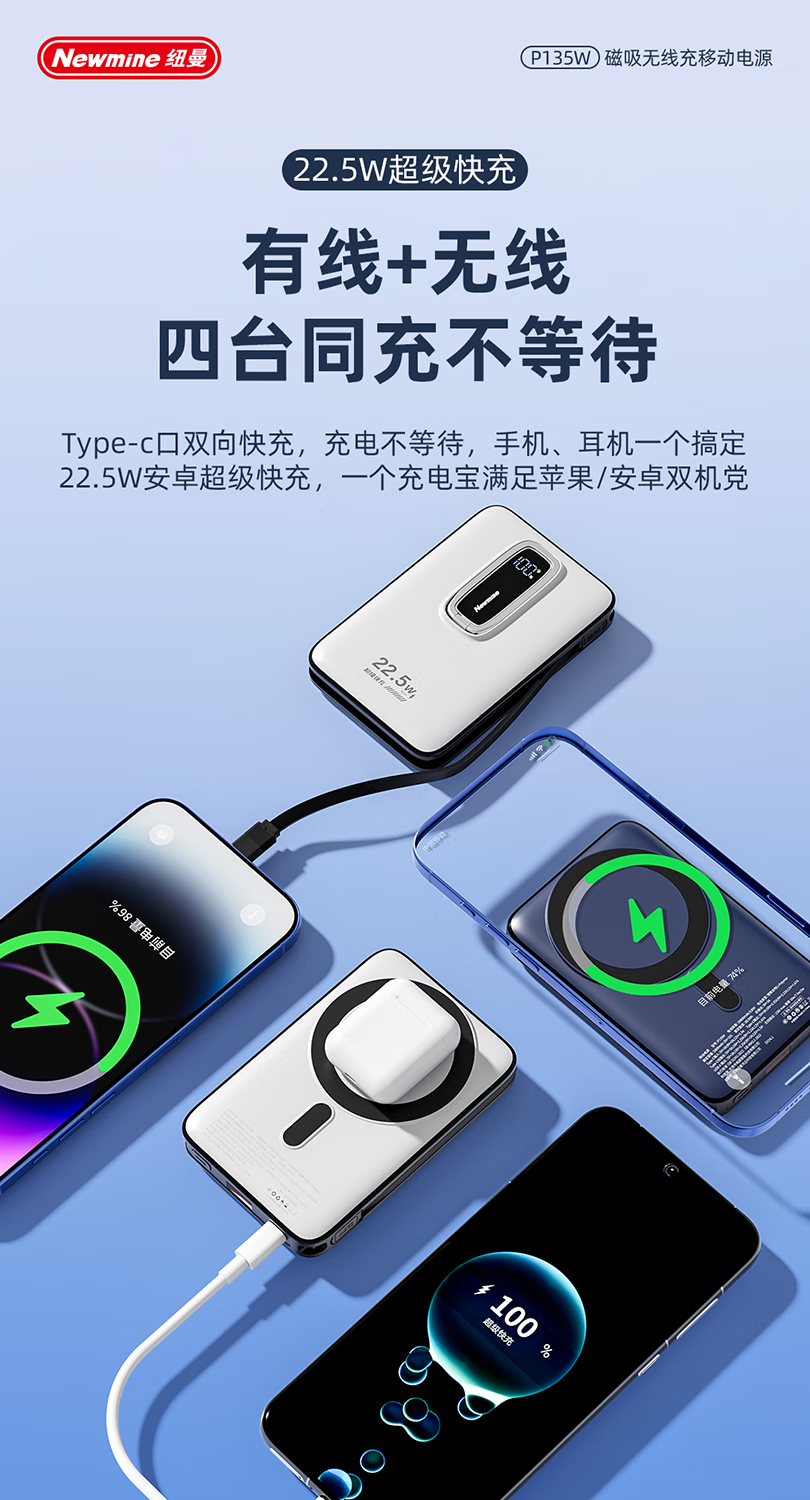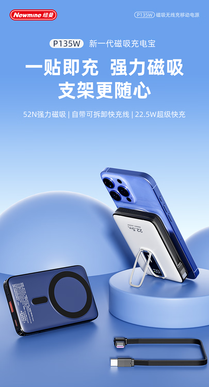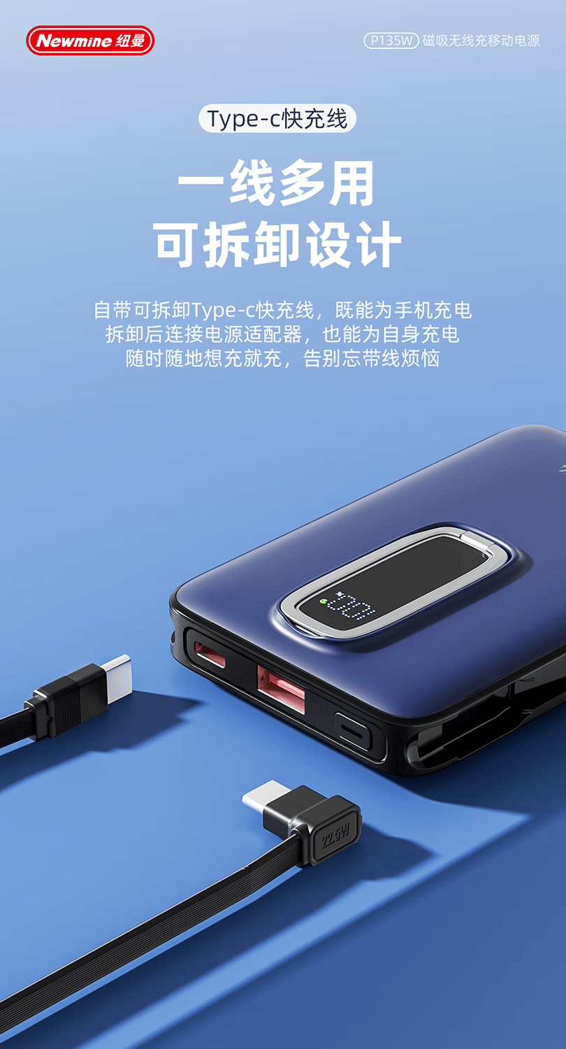 纽曼 10000毫安无线磁吸带线快充移动电源 P135W