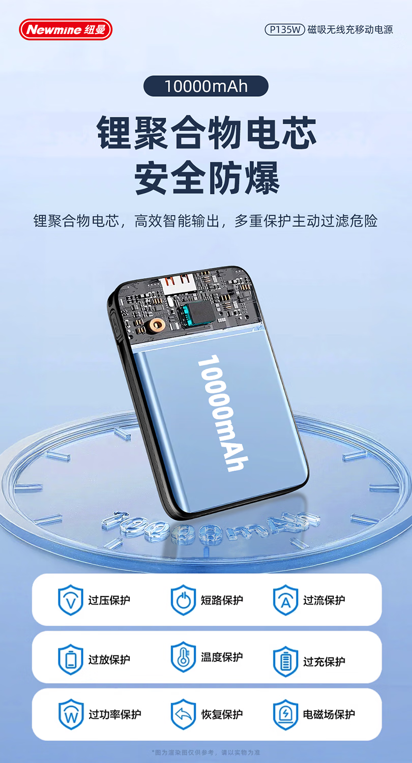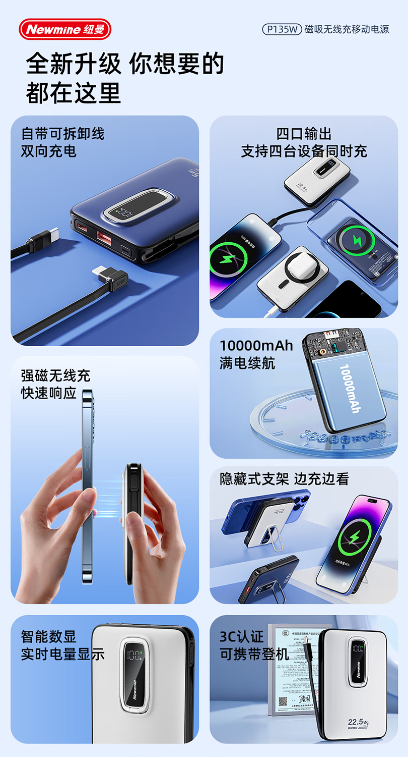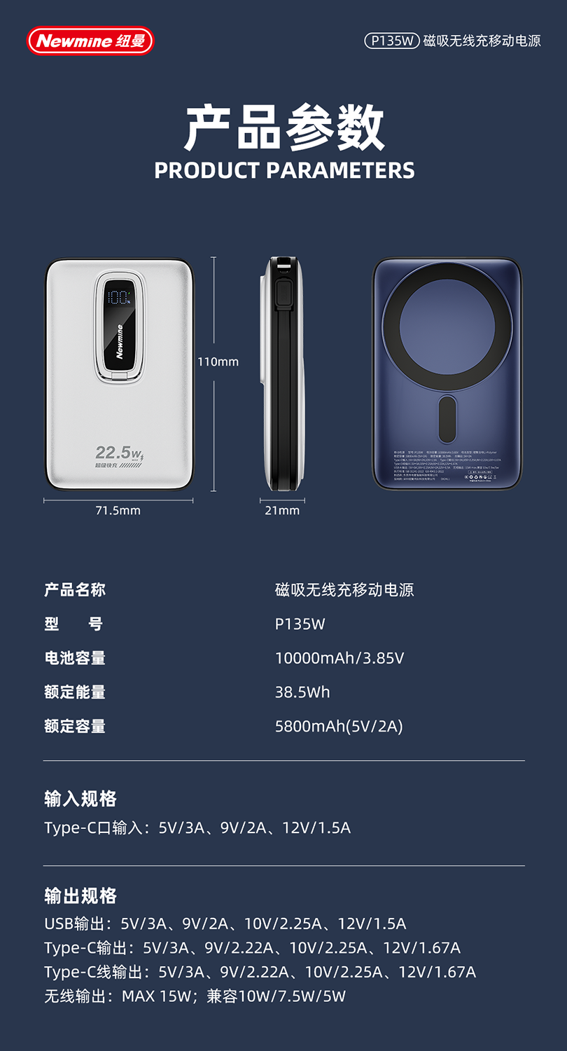 商品名称:纽曼 10000毫安无线磁吸带线快充移动电源 P135W
