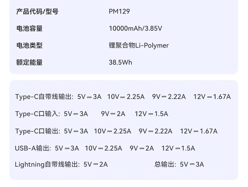 功能 :自带线 双向快充 轻薄便携