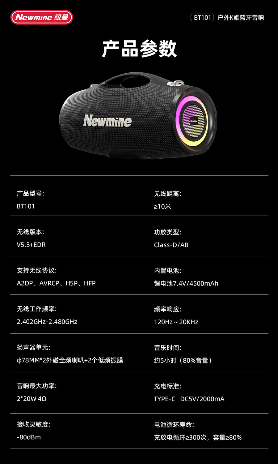 商品名称:纽曼 户外手提蓝牙音响(支持麦克风) BT101
