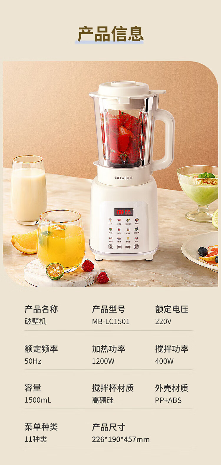 商品名称:美菱(MeiLing) 加热破壁营养料理机 MB-LC1501