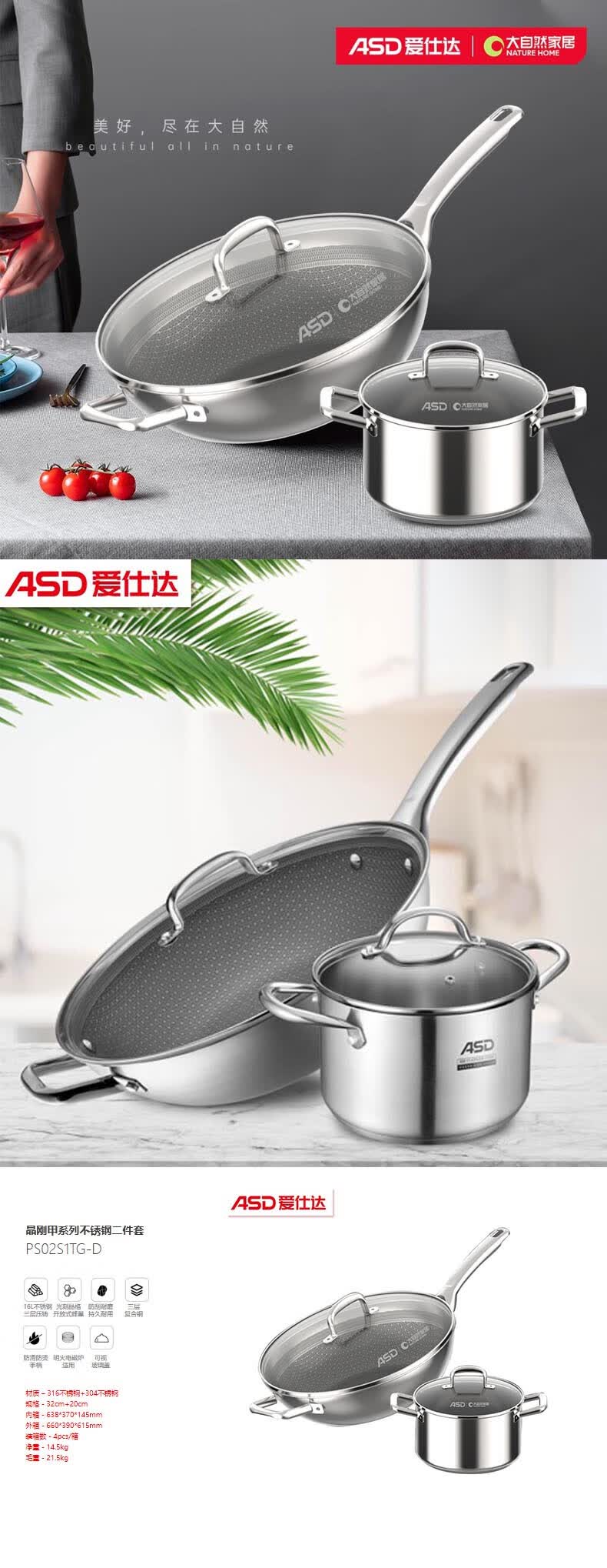 商品名称:爱仕达 ASD 晶刚甲系列不锈钢二件套 32cm+20cm PS02S1TG-D