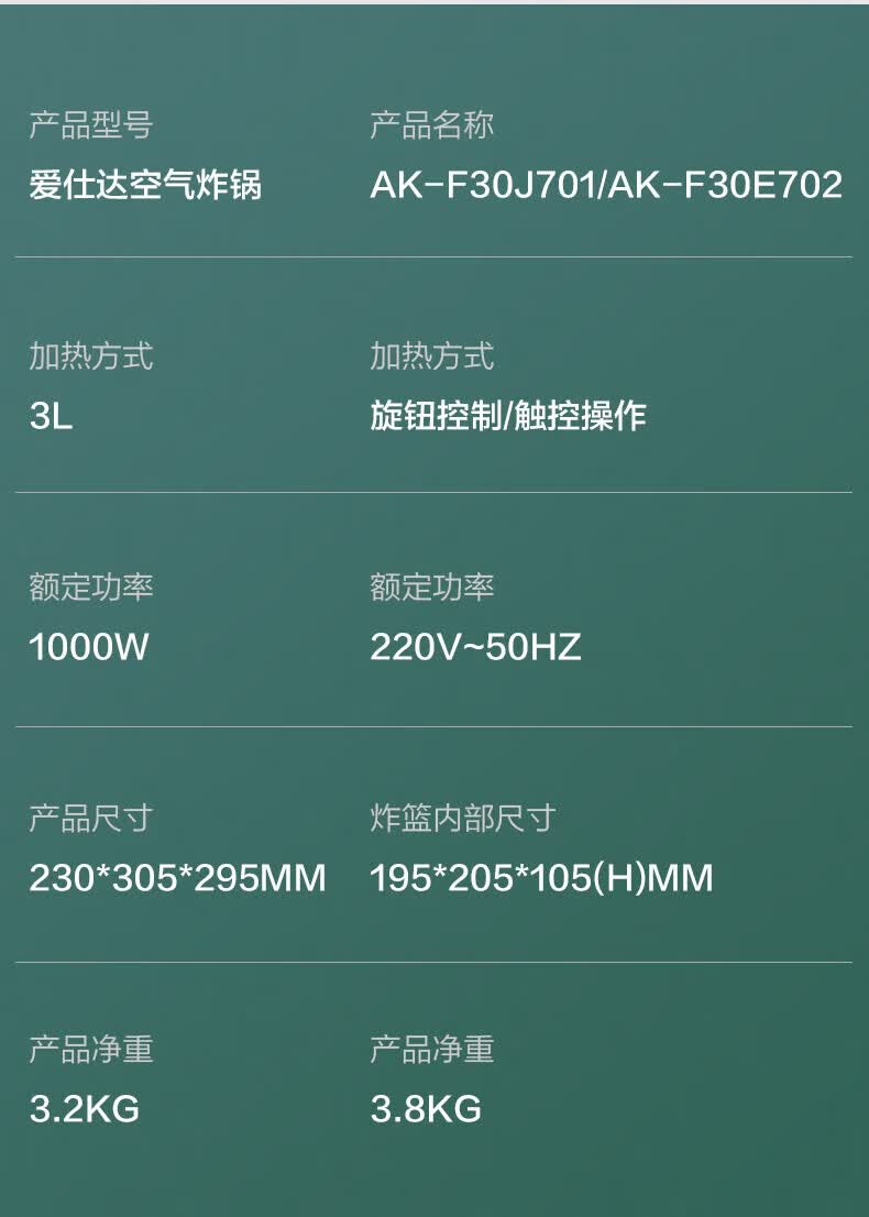 商品名称:爱仕达(ASD)空气炸锅 AK-F30E702 3L/1000W