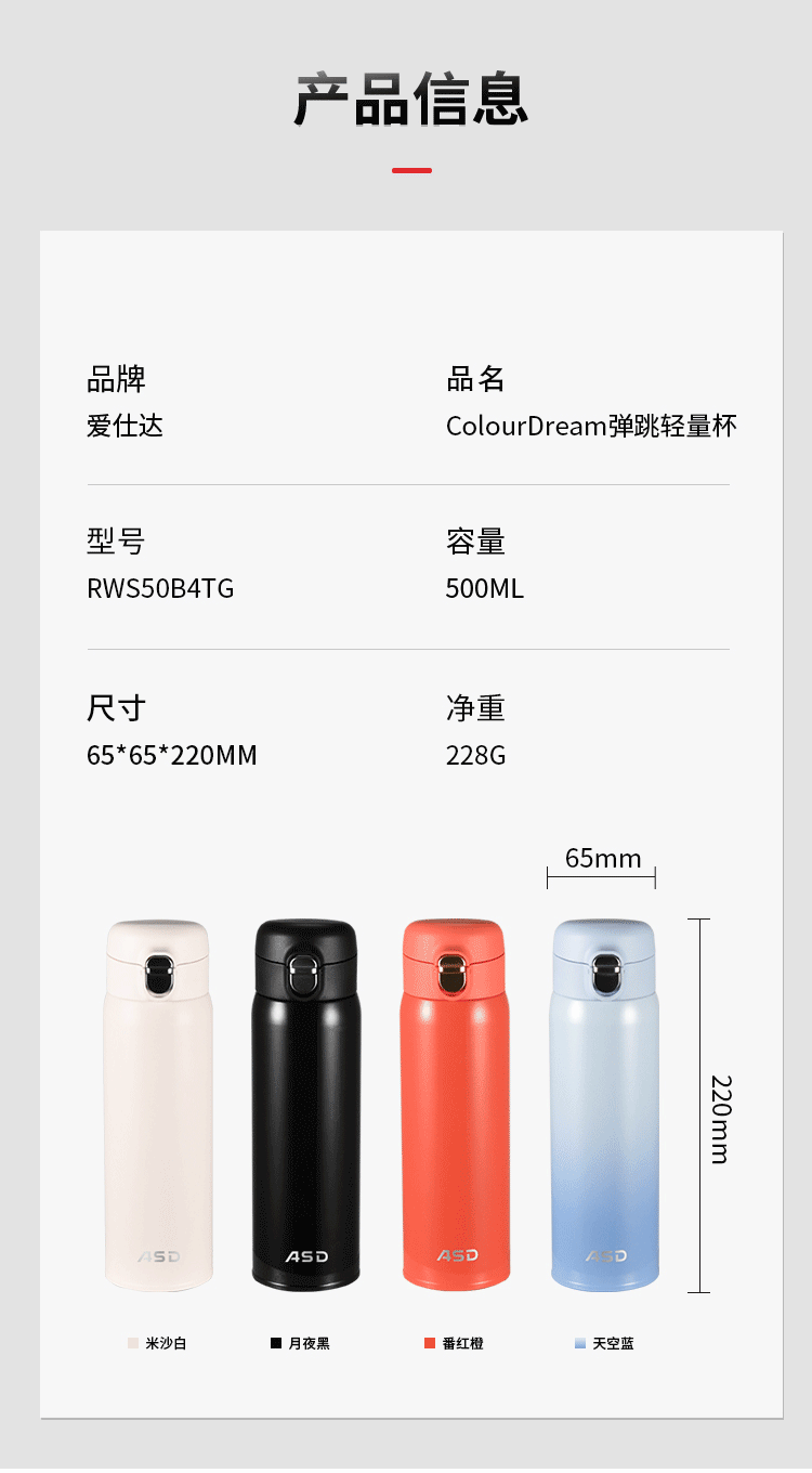 爱仕达(ASD)Every Moment系列·弹跳轻量杯 500ml RWS50B4TG-QM(订单制)白色
