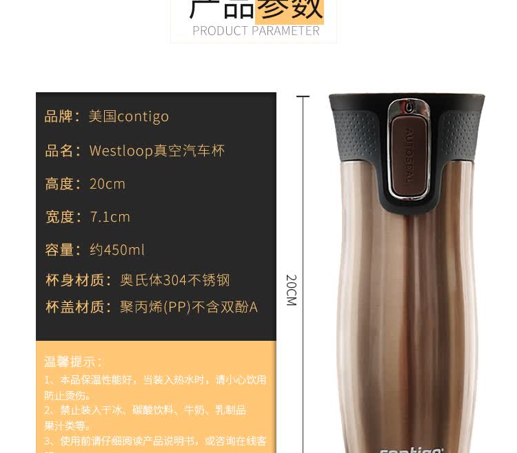 商品名称:contigo康迪克 Westloop 2.0 保温汽车杯 HBC-WLP 450ml
