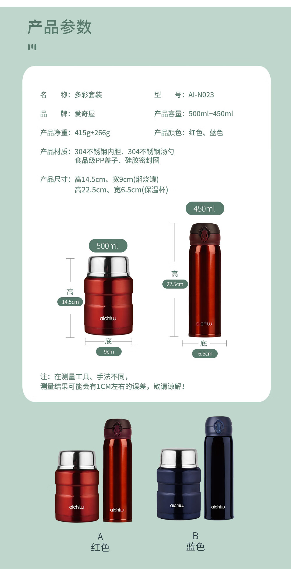 商品名称:爱奇屋(aichiw)多彩焖烧罐孩子保温杯长效保温便携饭盒 450ML+500ML AI-N023