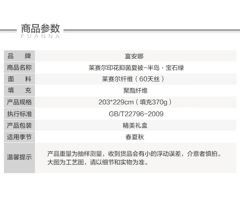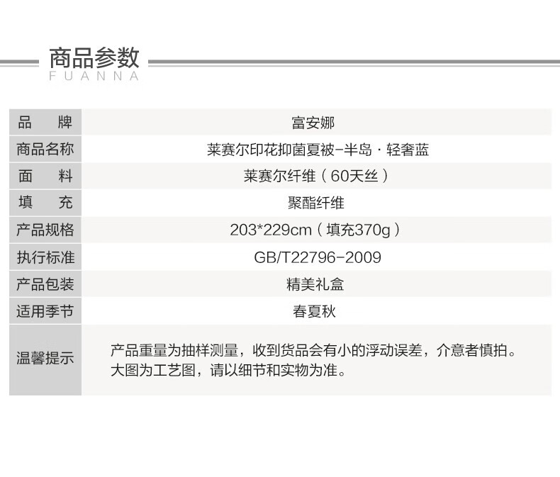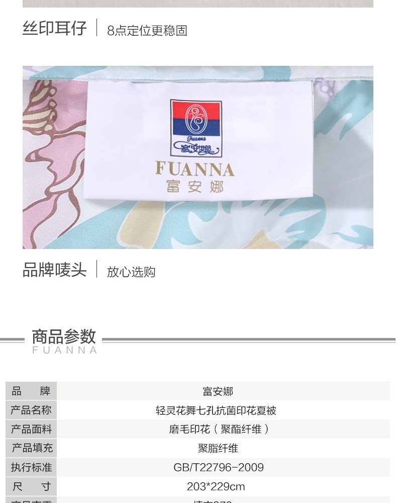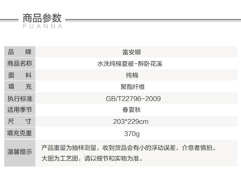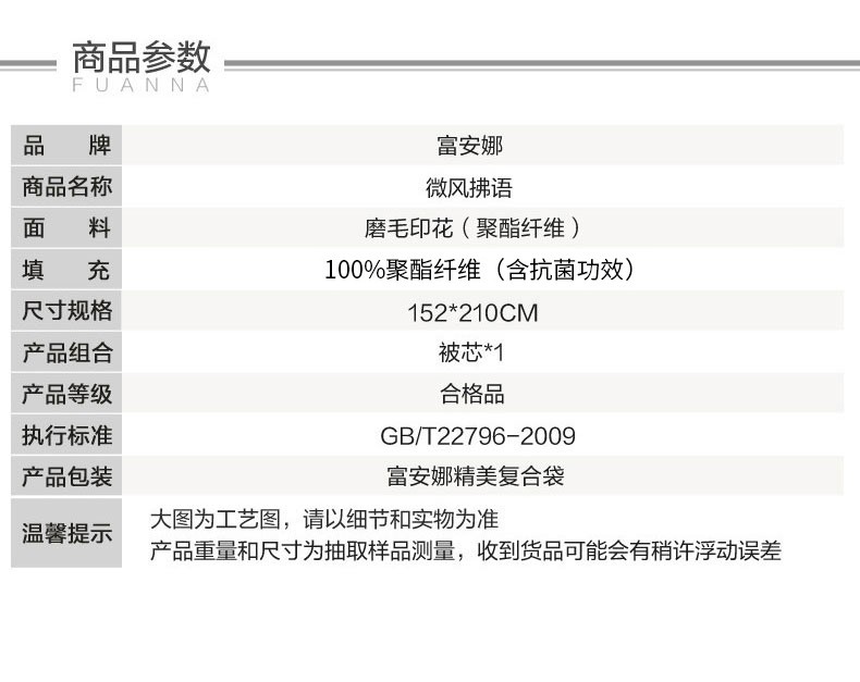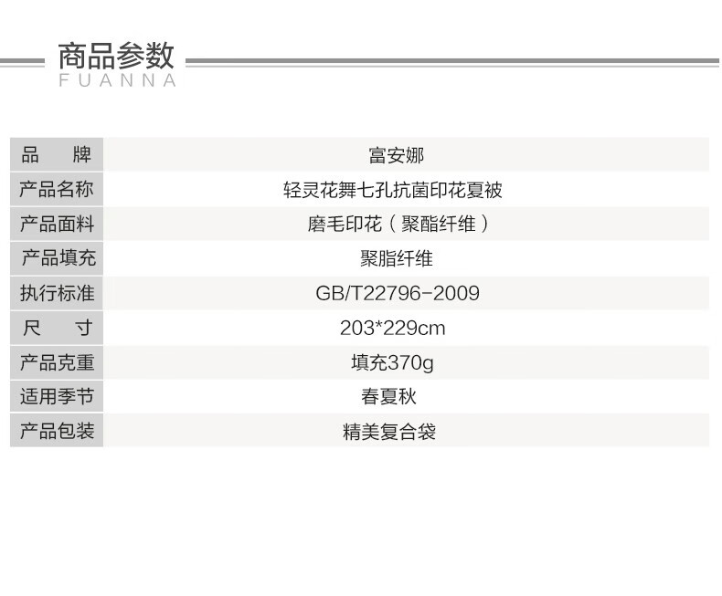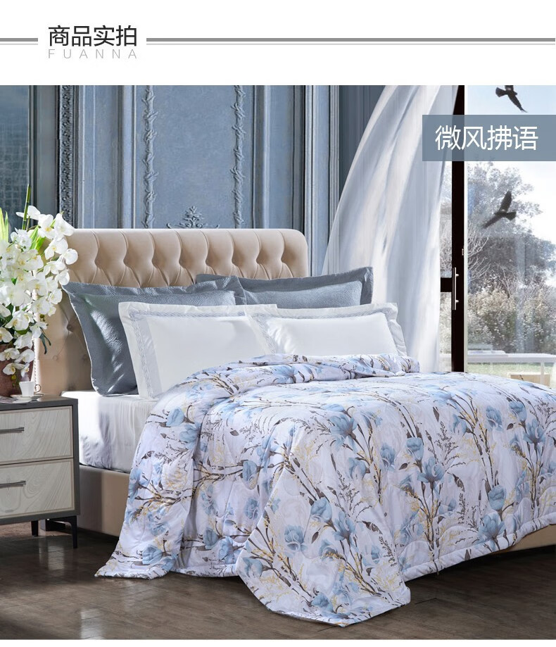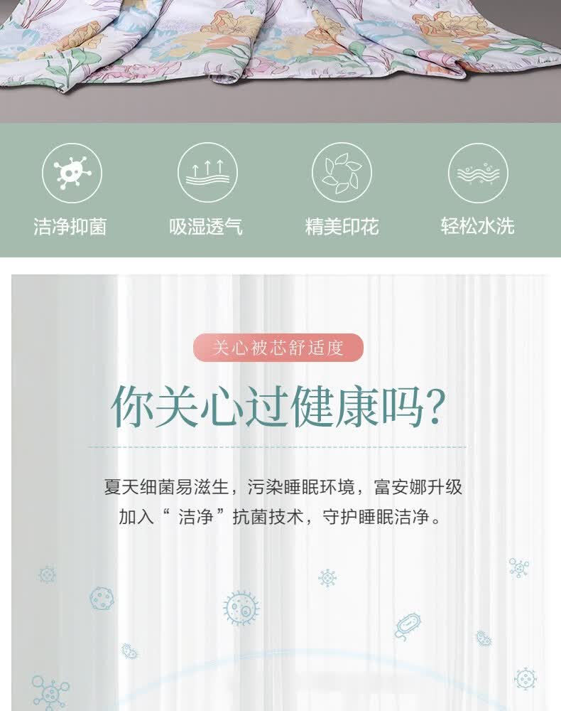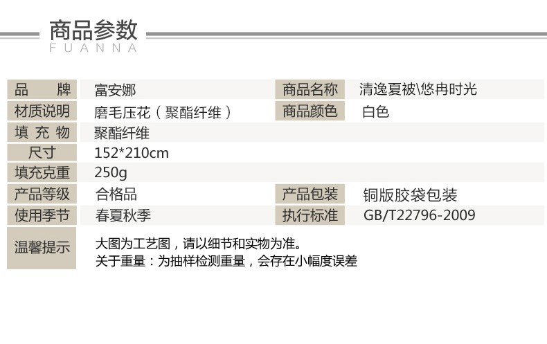 商品名称:富安娜家纺空调被子春秋被芯单双人被芯清逸夏被\悠冉时光1.2m床适用(152*210cm)